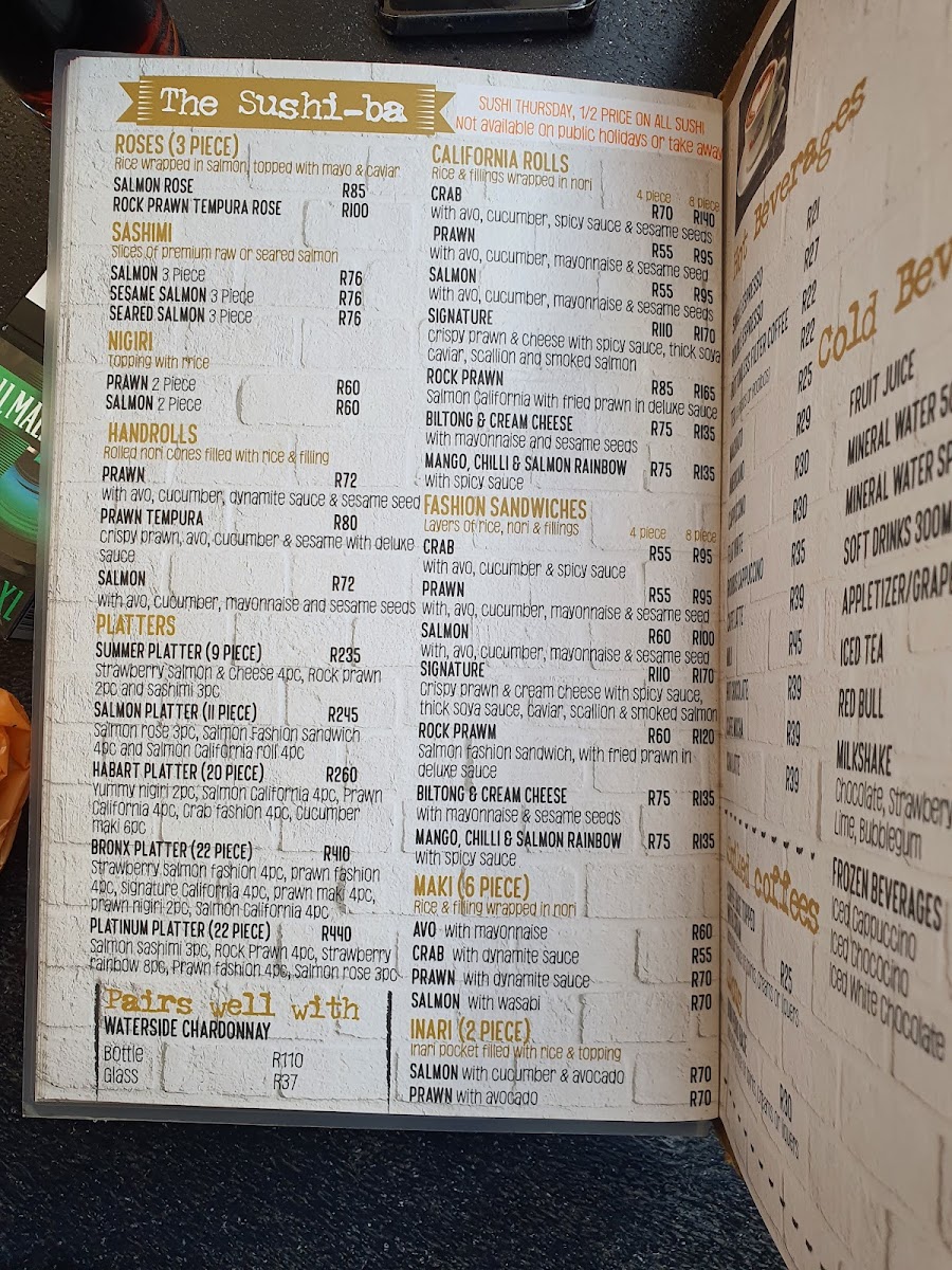 The menu also offers more substantial main courses like spaghetti bolognese, ribs with veggies, and an assortment of seafood including calamari and prawns with steak, catering well to different tastes and appetites. Signature dishes like the Harvard pudding and the sushi cake add a distinctive touch to the selection, inviting guests to explore something a little different amidst the relaxed environment.